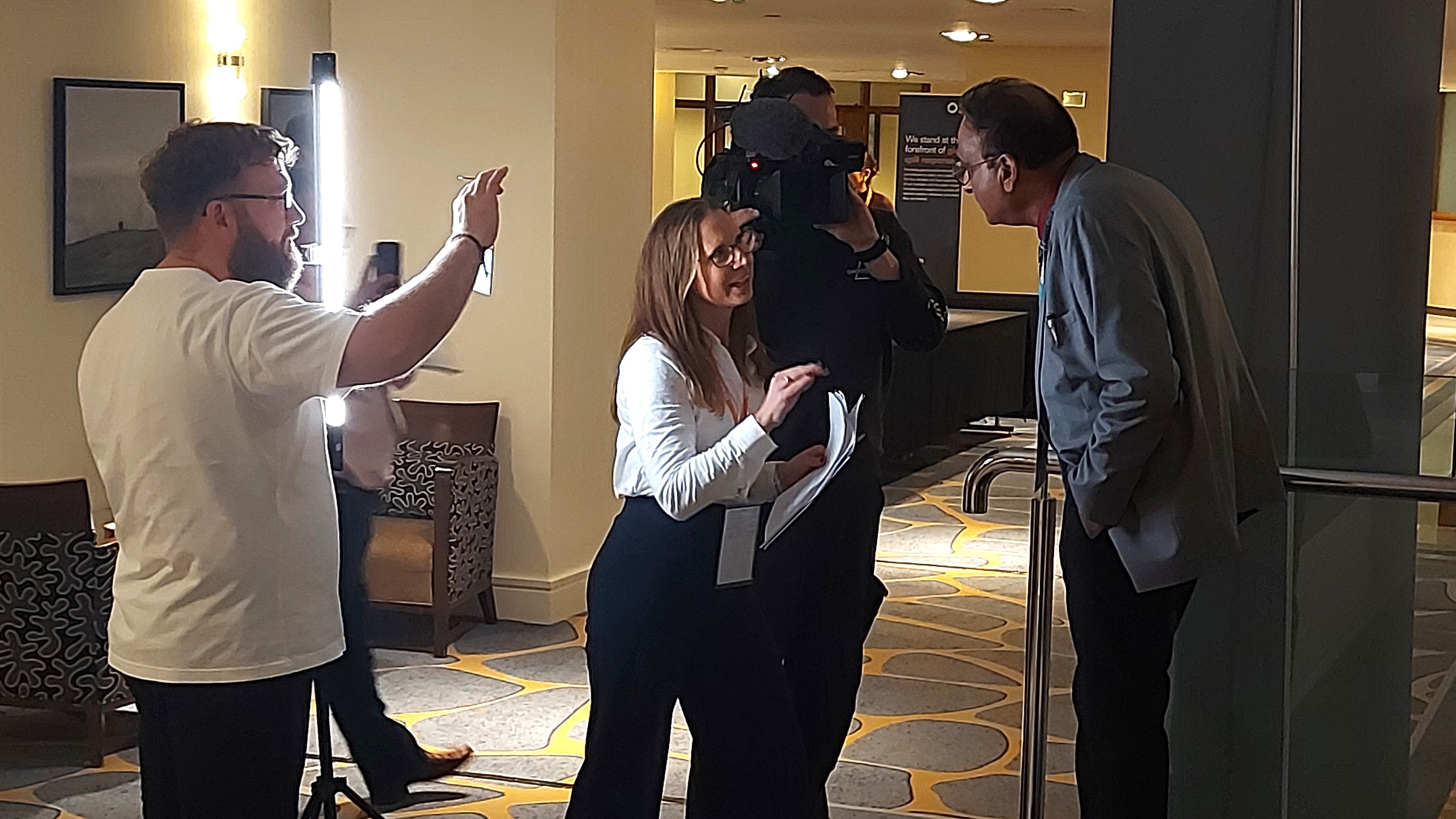 Exercise participants taking notes during a crisis exercise, wigth an AI-generated news broadcast about an oil spill threatening the Kenyan coastline.